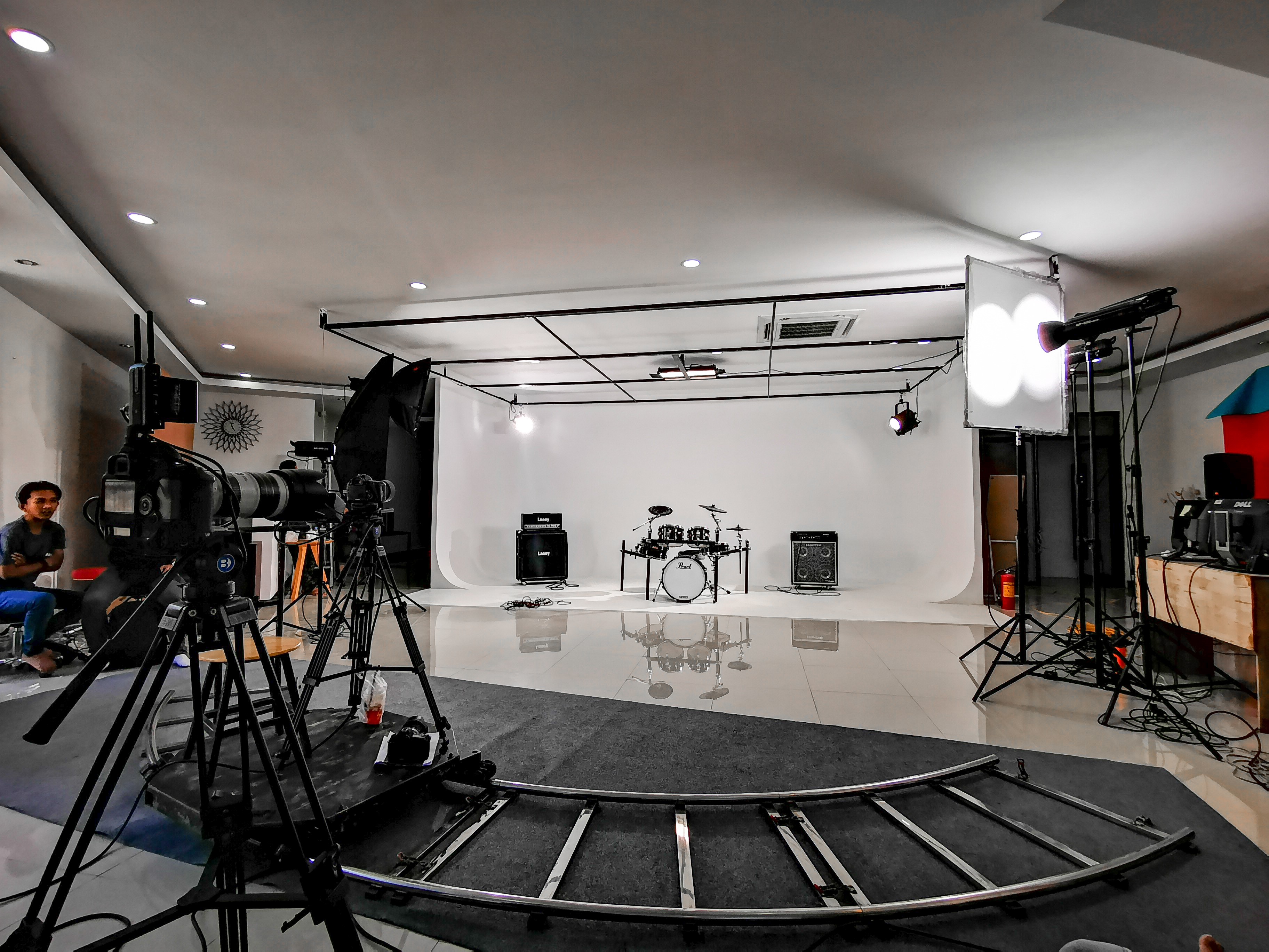 A medium size [3m x 8m] White Cyclorama wall for model & product photoshoot, dancing, band, Chroma key, etc. With build-in ceiling light, ceiling Air-Con & X3 LED light set. *Note: Power=63A mono far electricity. It’s available for rental at a suitable market rate.